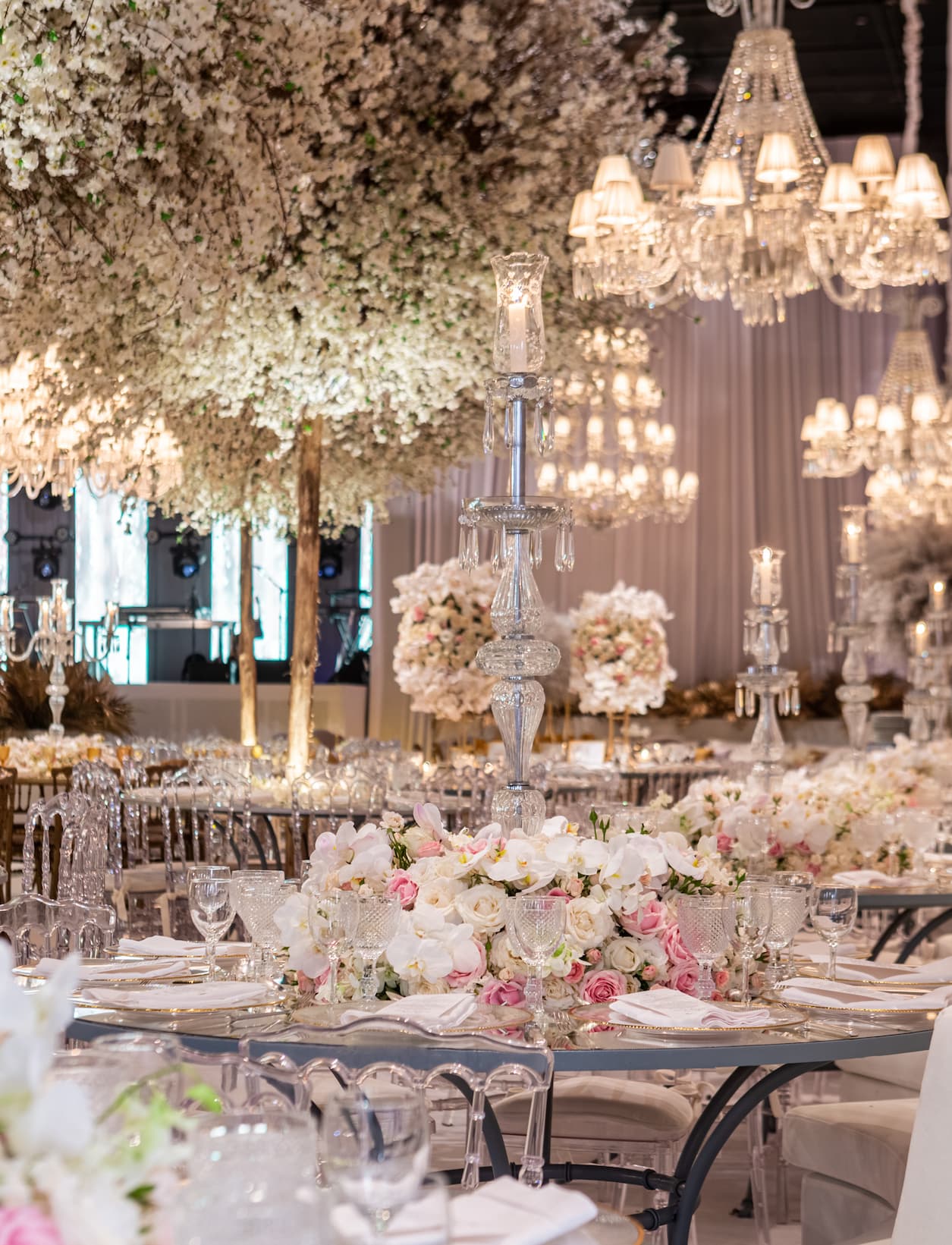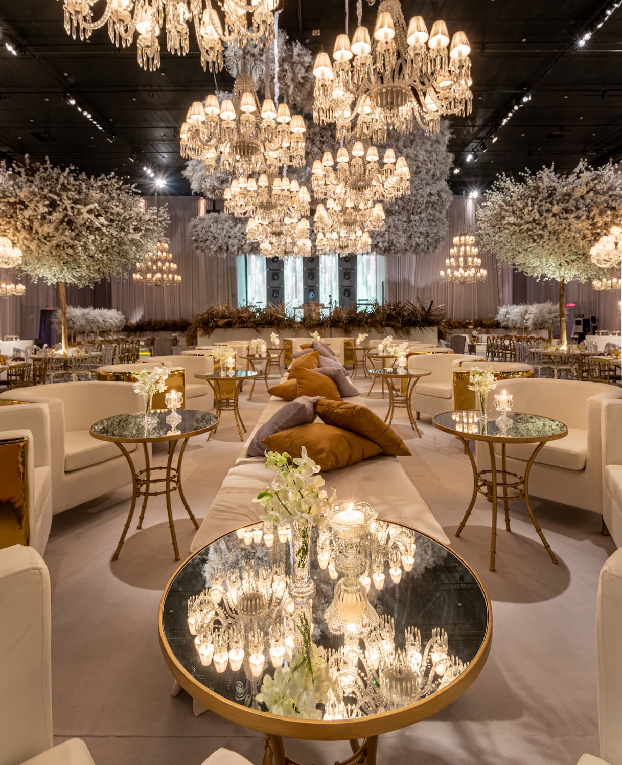 No centro do evento, concebemos um lounge elevado, adornado com poltronas brancas destacadas por detalhes dourados. Para envolver o campo de visão dos convidados e criar uma atmosfera acolhedora, incorporamos lustres Baccarat e um deslumbrante jardim suspenso. Cada elemento foi escolhido com cuidado para preencher todo o espaço, resultando em uma transformação completa do local. A combinação harmoniosa de móveis luxuosos, detalhes dourados, e elementos naturais elevou a experiência, proporcionando aos presentes uma sensação de requinte e encanto em cada direção que olhavam.