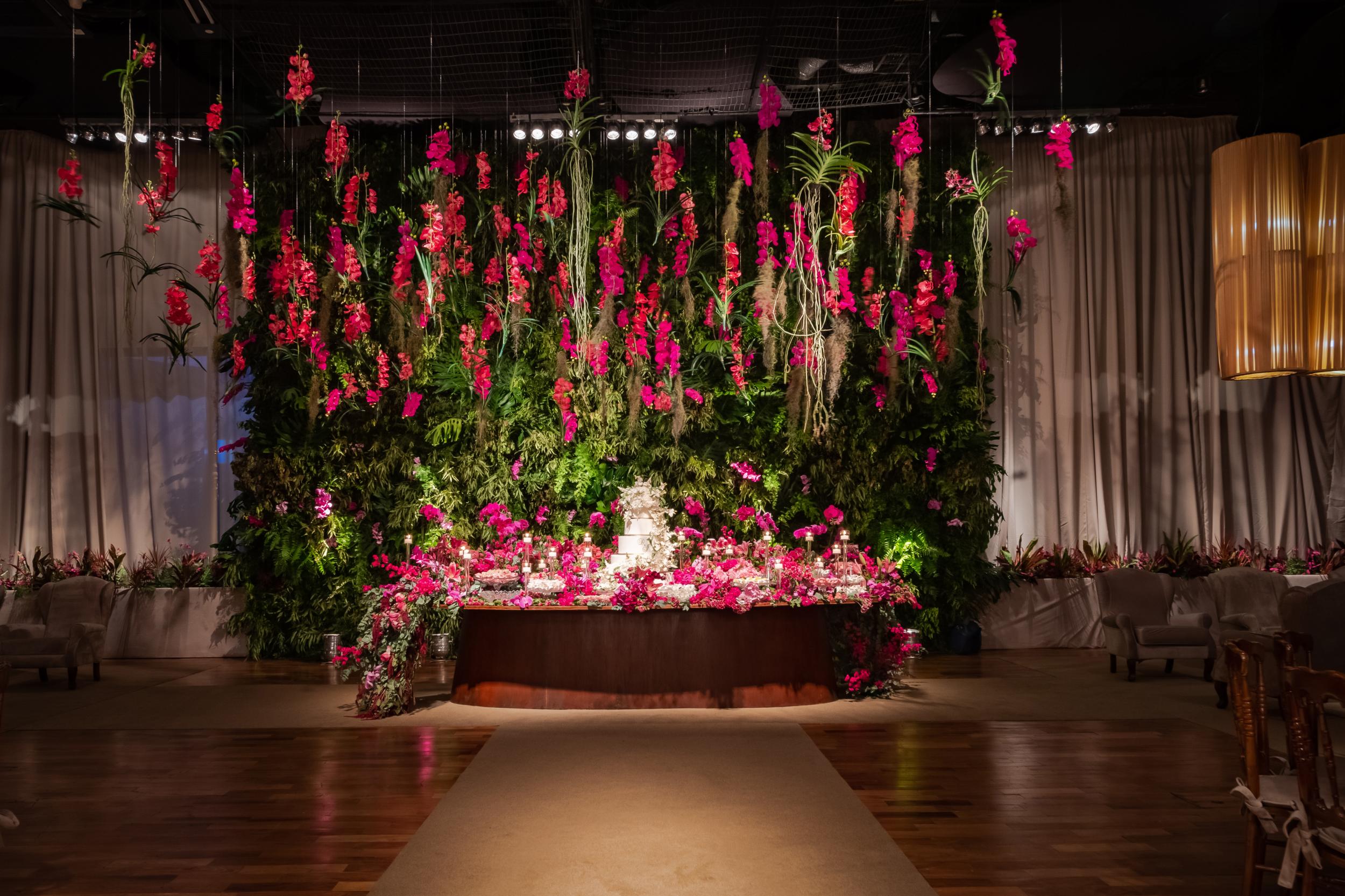 Ao adentrar o salão principal, a atmosfera se transforma em um espetáculo visual. Os lustres Baccarat, com seus cristais cintilantes, elevam o requinte a patamares majestosos, banhando o espaço com uma luminosidade resplandecente. As tonalidades vibrantes, habilmente incorporadas, injetam uma vivacidade contagiante, conferindo à cena uma energia única. A cenografia aérea, cuidadosamente elaborada, é um deleite para os olhos. Os lustres, além de sua imponente presença, criam uma sinfonia de brilho que dança pela sala. Para complementar essa experiência visual, uma composição aérea de flores foi meticulosamente integrada ao salão. As orquídeas rosas, delicadamente suspensas do teto, proporcionam uma cascata de elegância e beleza, tornando o ambiente ainda mais exuberante.